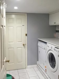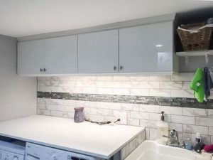 We added a back-splash around the sink to prevent water from getting through the walls. This was important because they regularly bathed their dog in this sink. We added high gloss cabinets along the wall for more storage space and added under-cabinet LED lighting. We also made the room brighter by adding recessed pot lights in the ceiling.