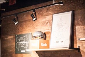 New laminate wood flooring was put in with baseboards to replace the old flooring which looked too busy and detracted from the products on display. The wall with the plywood finish served as the ideal spot to showcase Urban Machina’s products. The wood was stained and custom shelving was put in to display their products. Halogen track lighting was installed to give the space that warm, classy showroom feel. Pony walls were set up to create designated spaces for the window displays. A fresh coat of paint was added to the walls.