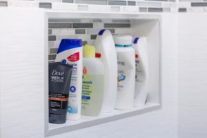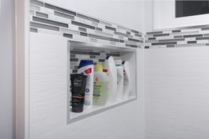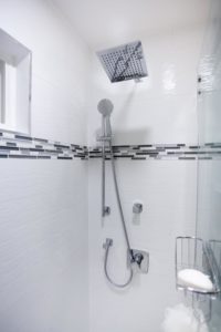 The lowered ceiling in the shower was completely removed to make the bathroom feel larger and more open.
